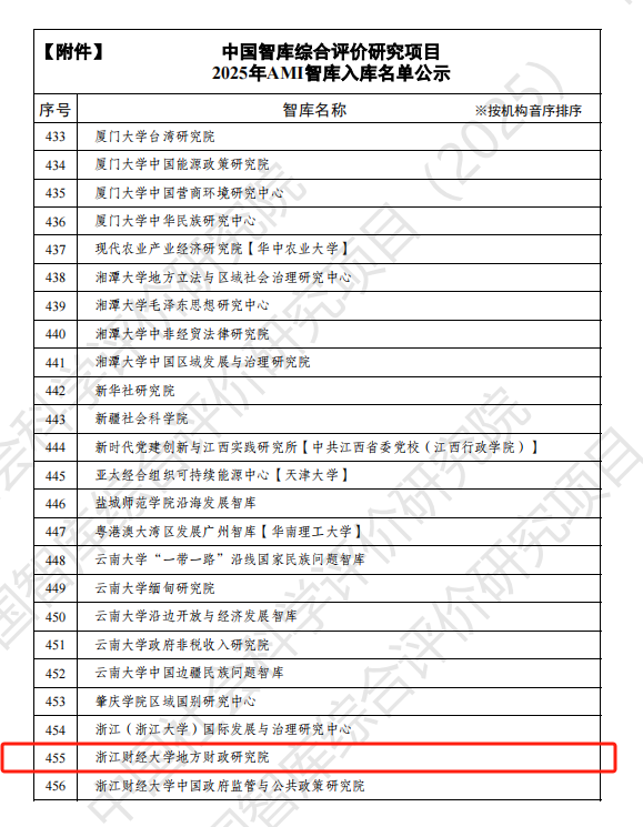 近日,中国社会科学评价研究院“中国智库综合评价研究项目(2025)”完成入库初审和入库复审等各项工作,自该项目启动以来,评价院以四年为周期,基于“智库综合评价AMI指标体系”,循环开展全球智库评价研究和中国智库综合评价研究等品牌项目。本次,浙江财经大学地方财政研究院成功入选第三轮中国智库综合评价研究项目。